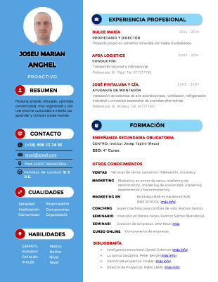 También te queremos recordar que se trata de un Currículum interactivo. Esto quiere decir que tendrá acceso a diferentes páginas web a aplicaciones tanto en pc como en móviles. Con contacto directo de llamada por teléfono o email.